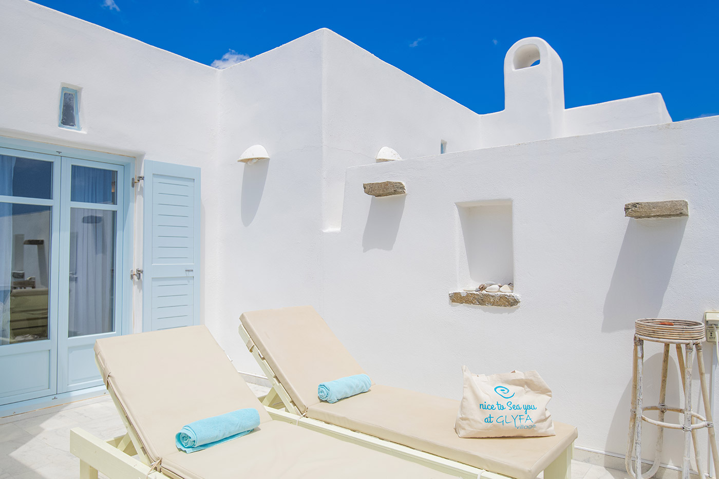 Relax in the outdoor mini spa and feel the breeze from the Aegean sea in this 40sq.m. independent apartment. A spacious living space with one sofa bed and separate bedroom is an ideal holiday choice for small families and couples. Elegant furnishing, fully equipped kitchen and stylish décor surround the well being of the apartment and create the best conditions to enjoy your vacation and get to know the authentic face of Paros, one of the top summer destinations in the Cyclades.